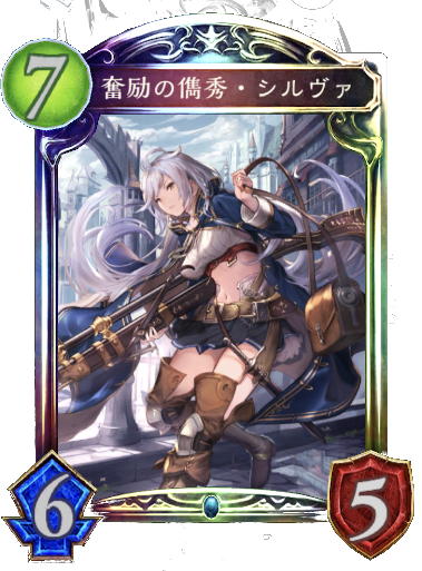 :アクセラレート3 手札の元のコスト3以下のフォロワー1枚を場に出す。それは突進を持つ。このバトル中、自分のリーダーは「自分のターンごとに1回、自分のフォロワーが攻撃するとき、相手のリーダーに1ダメージ」を持つ。(奮励の儁秀・シルヴァの能力が複数働いた場合、リーダーは同じ能力を複数持つ)
